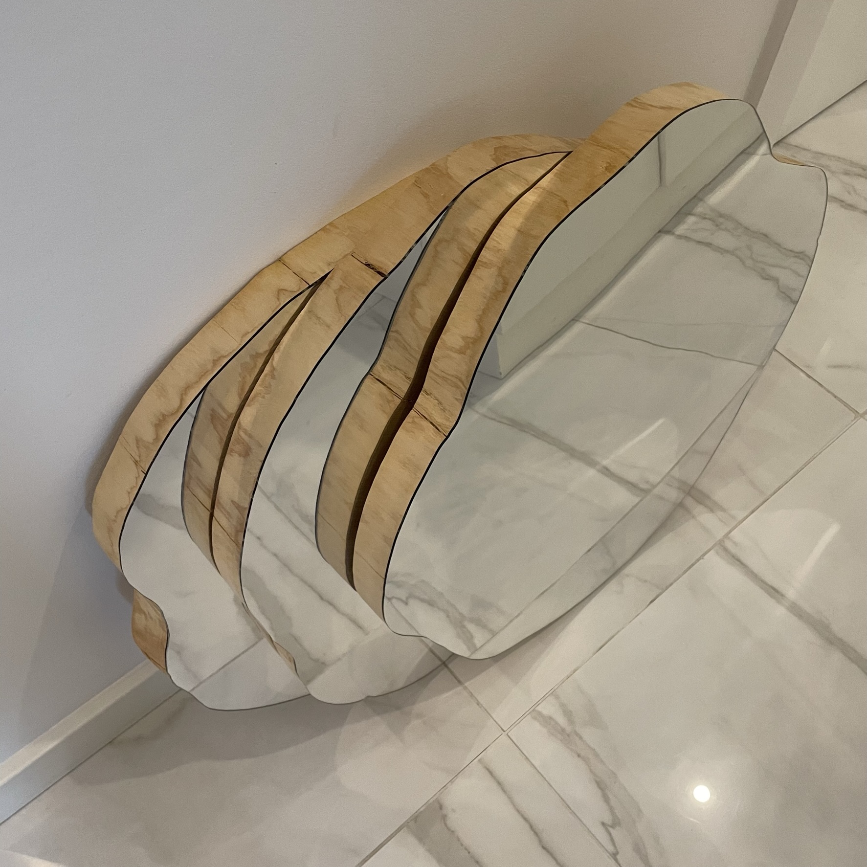 • Três espelhos com molduras douradas onduladas encostados na parede sobre chão de mármore branco