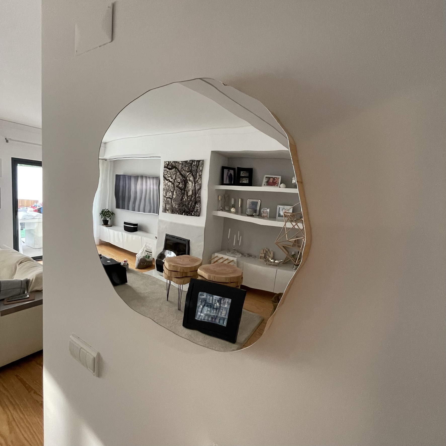 • Espelho de parede decorativo com bordas irregulares refletindo sala de estar moderna