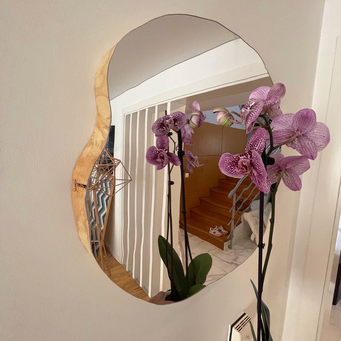Espelho de parede com moldura irregular em madeira refletindo orquídea cor-de-rosa